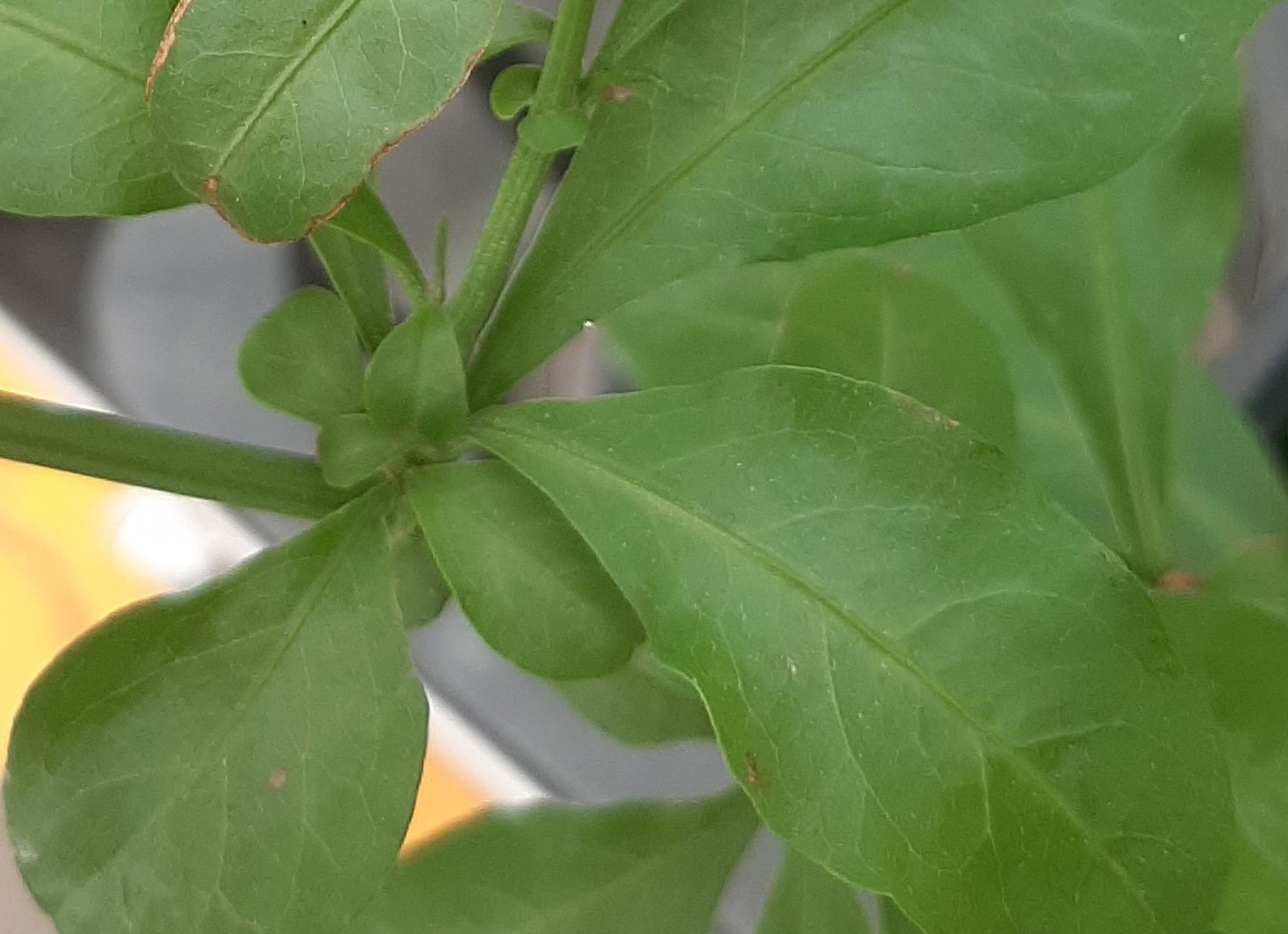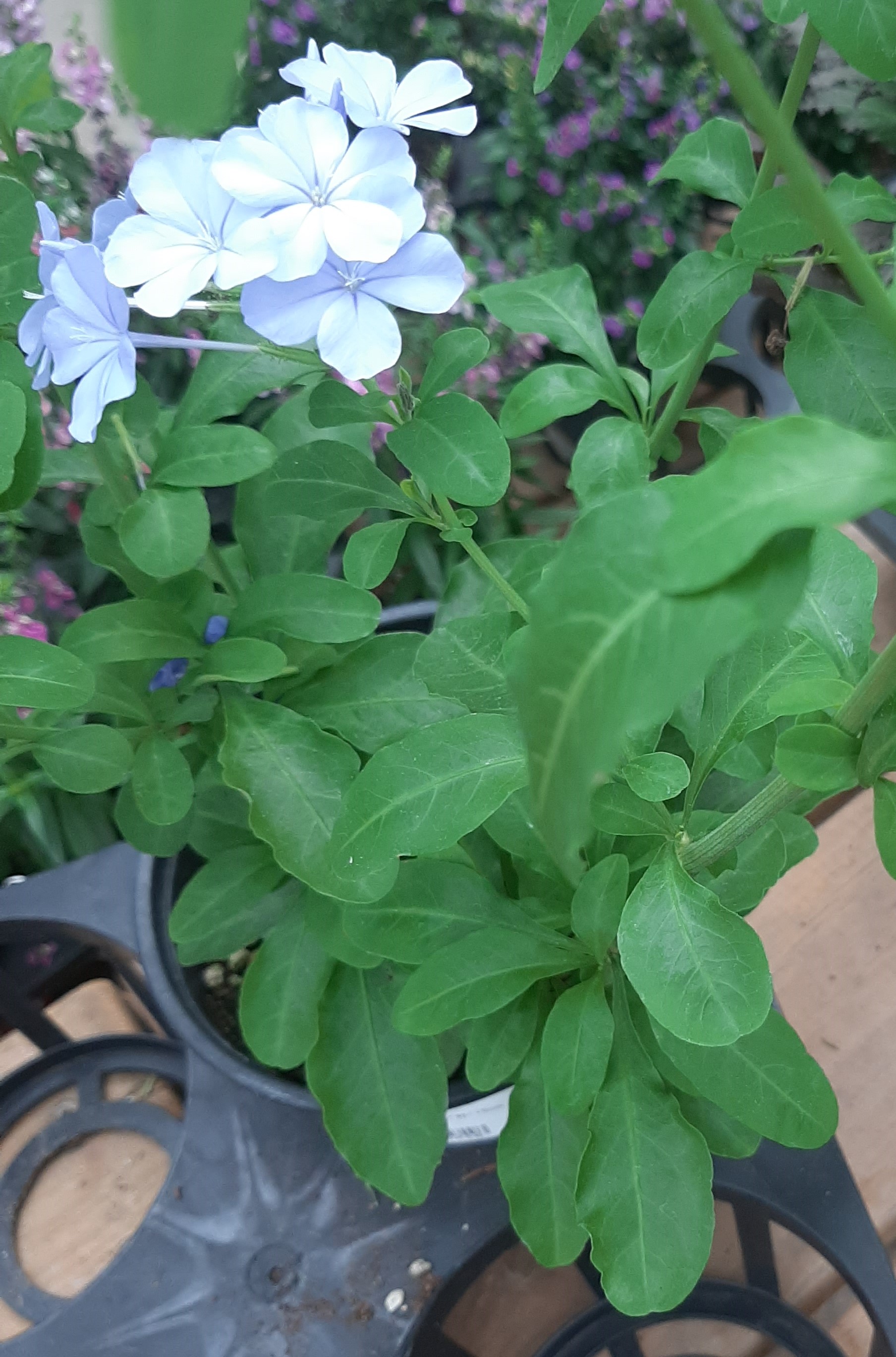 Plumbago auriculata is an evergreen shrub, often grown as a climber, ascending rapidly to 6 m (20 ft) tall by 3 m (10 ft) wide in nature, though much smaller when cultivated as a houseplant. The leaves are a glossy green and grow to 5 cm (2 in) long. The stems are long, thin, and climbing. The leaves alternate and are 2-5 cm.