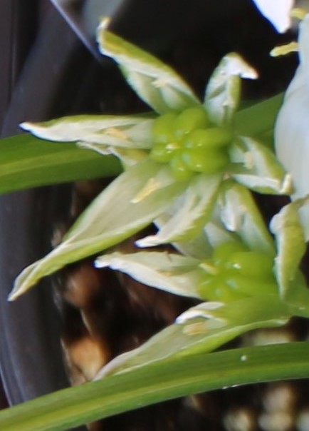 Clump of scapes with closed flowers arising from basal leavesThe inflorescence bears 6–20 flat star shaped flowers on ascending stems (pedicels) (3–3.5 cm (1.2–1.4 in)) associated with membranaceous leaflets (bracts) (2.5–3 cm (0.98–1.18 in)) in an open branching umbrella (umbel) shaped terminal cluster, described as a corymbose raceme. The petal-like perianth is radially symmetric (actinomorphic), which is 1.5–2 centimetres (0.6–0.8 in) in diameter, consists of six lanceolate tepals which are white with a green stripe on the underside (outside), 15 mm (0.59 in) in length and 5 mm (0.20 in) wide. From the outside the closed flower appears green with white margins.