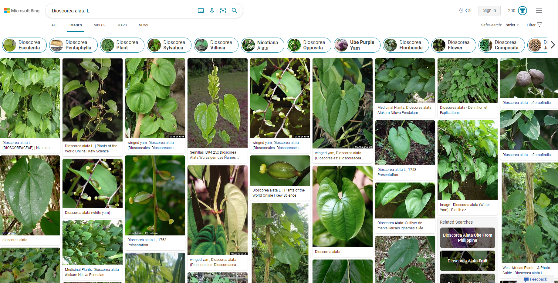 Dioscorea alata L.(열대둥근마)를 검색하면