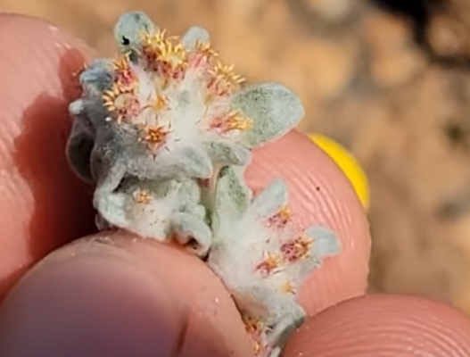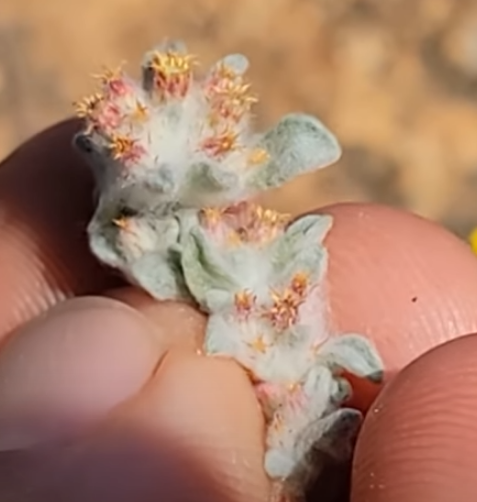 Grey-woolly annual herb with a slender taproot, branches 15-150 mm long, many from the crown, simple or much branched, slender, prostrate, often reddish, loosely woolly, distantly leafy but leaves crowded under the heads and at the crown. Radical leaves often withered at flowering, mostly 15-30 x 5-10 mm, oblong-elliptic to spathulate, apex rounded, base narrowed, margins flat, cauline leaves similar, but often smaller, mostly 5-15 x 1.5-6 mm, oblong-elliptic to spathulate, often folded lengthwise, apex recurved, all with both surfaces loosely grey-woolly. Heads heterogamous, campanulate, c. 3-4 x 2-2.5 mm, sessile or shortly pedunculate, crowded in terminal glomerules c. 5-15 mm across. Involucral bracts in 3-4 series, outermost short, webbed with wool to leaves, inner subequal, exceeding flowers, backs woolly, tips usually acuminate, often markedly squarrose, rarely only acute, dull yellow, orange or red, sometimes red above the stereome. Receptacle nearly smooth. Flowers 20-37, (1-) 2-7 female, 18-30 homogamous, yellow, sometimes tipped red. Achenes 0.75 mm long, with myxogenic duplex hairs, or rarely glabrous. Pappus bristles equaling corolla, barbellate above, scabrid below, bases cohering lightly by patent cilia.