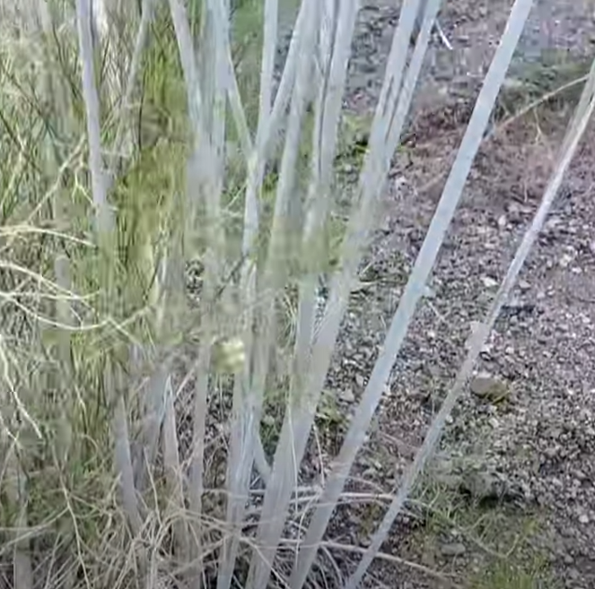 Asclepias albicans is a species of milkweed known by the common names whitestem milkweed and wax milkweed. It is native to the Mojave and Sonoran Deserts of California, Arizona, and Baja California. This is a spindly erect shrub usually growing 1 to 3 meters (3+1⁄2 to 10 feet) tall, but known to approach 4 meters. The sticklike branches are mostly naked, the younger ones coated in a waxy residue and a thin layer of woolly hairs. The leaves are ephemeral, growing in whorls of three on the lower branches and falling off after a short time. They are linear in shape and up to 3 centimeters (1+1⁄4 inches) long. The inflorescence is an umbel about 5 cm (2 in) wide which appears at the tips of the long branches and sprouting from the sides at nodes. The inflorescence contains many purple-tinted greenish flowers, each about 1.5 cm (1⁄2 in) wide, with a central array of bulbous hoods, and corollas reflexed back against the stalk. The plant usually blooms from March to May. The fruit is a large, long, thick follicle which dangles in bunches from the branch nodes.