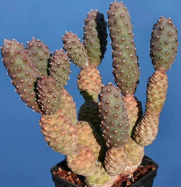 Stem: It produces dull greyish-blue, greyish-brown to earth-tone coloured pine-cone-like globular to elongated stem segments 2 to 20 cm long, the segment are hardly tuberculate (except in drying) and generally grow longer and narrower than the standard Tephrocactus articulatusSN|7330]]SN|7330]]. The segments usually grow one or two new segments each year from the stem tips.