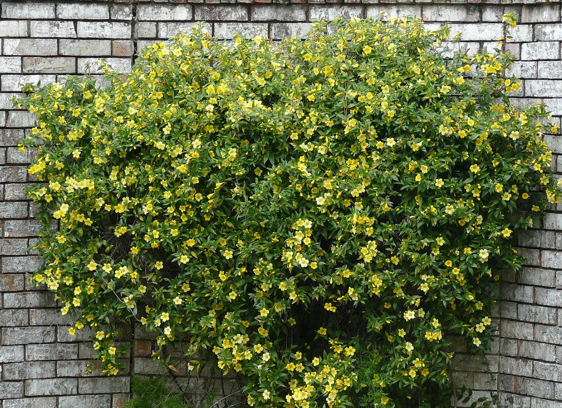 Gelsemium sempervirens can grow to 3–6 m (10–20 ft) high when given suitable climbing support in trees, with thin stems. The plant is perennial. The leaves are evergreen, lanceolate, 5–10 cm (2–4 in) long and 1–1.5 cm (3⁄8–5⁄8 in) broad, and lustrous, dark green. The flowers are borne in clusters, the individual flowers yellow, sometimes with an orange center, trumpet-shaped, 3 cm (1+1⁄4 in) long and 2.5–3 cm (1–1+1⁄4 in) broad. Its flowers are strongly scented and produce nectar that attracts a range of pollinators.