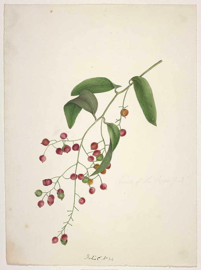 In summer, when the conditions are right, the tips of the vines can grow up to 5 cm per day, allowing the vines to climb high into the canopy. When the vines reach the sunlight at the top of the canopy, they begin to produce green leafy stems (as opposed to the brown woody stems below). The leaves are opposite, ovate and shiny. The fruits are small (1 cm diameter), red berries.