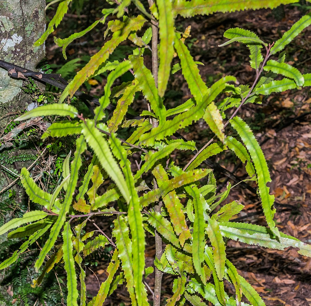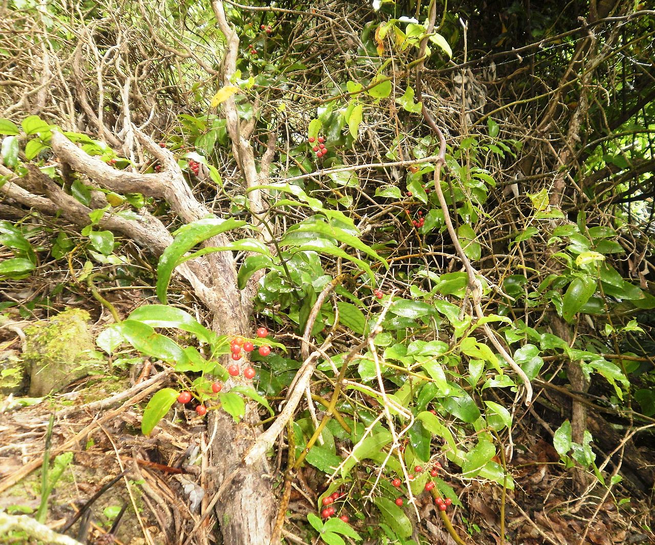 The supplejack vine is an evergreen climbing vine or liana. It climbs by coiling its hard but flexible stems around tree trunks and branches. When there are no supporting trees for the vines to climb up, the vines form a dense knotted tangle on the forest floor. It starts its life as a sappy stem searching for a support, and in the first few years of growth, the supplejack resembles a small shrub, but in its later seasons the stems start to spiral around the supporting trees.