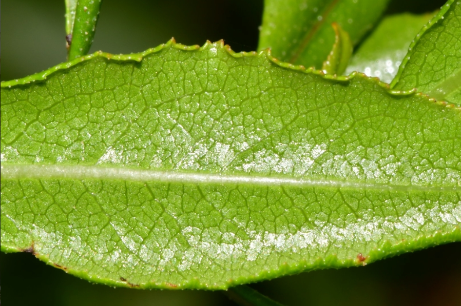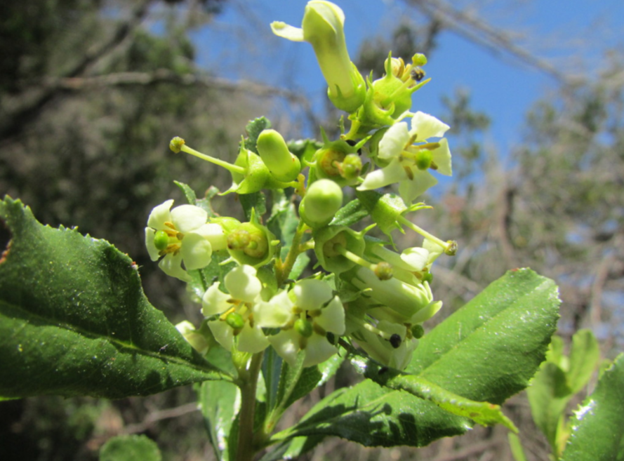 An open, loose-habited, evergreen shrub up to 10 (perhaps more) ft high; branchlets not downy, but furnished with stalked glands, and resinous when young. Leaves obovate or oval, from 3⁄4 in. to 21⁄2 in. long, nearly to quite half as wide; tapered at the base, rounded or abruptly pointed at the apex, finely toothed, not downy on either surface, but glossy green above and more or less clammy with a resinous secretion when young; stalk 1⁄8 to 1⁄4 in. long. Panicle 3 or 4 in. long, 11⁄2 in. diameter, cylindrical, thinly hairy and glandular; each branch of the panicle one- to five-, more often three-flowered and springing from the axil of a leaf-like bract. Flowers white, 1⁄3 in. wide at the top, the claws of the petals forming a tube 1⁄2 in. long. Calyx green, bell-shaped, with five linear lobes.
