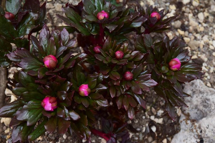 This peony has grey to brown roots shaped like carrots, about 2 cm (0.79 in) in diameter near the attachment of the stems and gradually becoming narrower towards their tips. It has stiff, erect, hairless, green to purple stems of 35–80 cm (14–31 in) high with five to seven scales at their base. The leaves have green to purple stalks which are hairless or carry soft hairs. The lower leaves further consist of three sets of mostly three rarely incised ovate to elliptic leaflets, each 4–13 cm (1.6–5.1 in) long and 2–8 cm (0.79–3.15 in) wide. These have a wedged to round base, an entire margin, a pointy tip, a hairless upper surface and a variously but mostly densely softly-hairy undersurface.