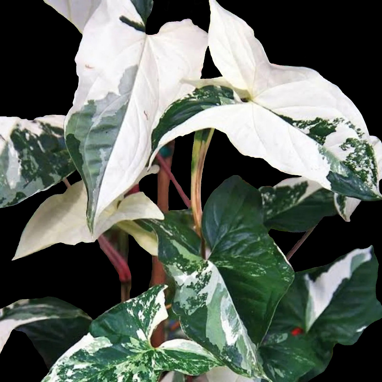 It features arrow-shaped light green leaves with white variegations. Indoor growers admire them for their multicolored foliage. They feature a lot of white on a bright green backdrop.
