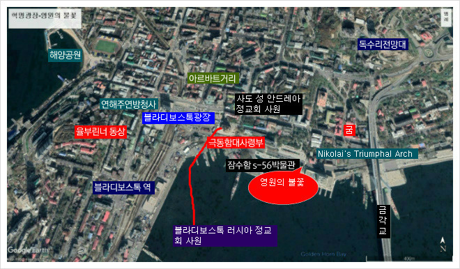신한촌->해양공원->아르바트거리->율부린너 동상->블라디보스톡 역